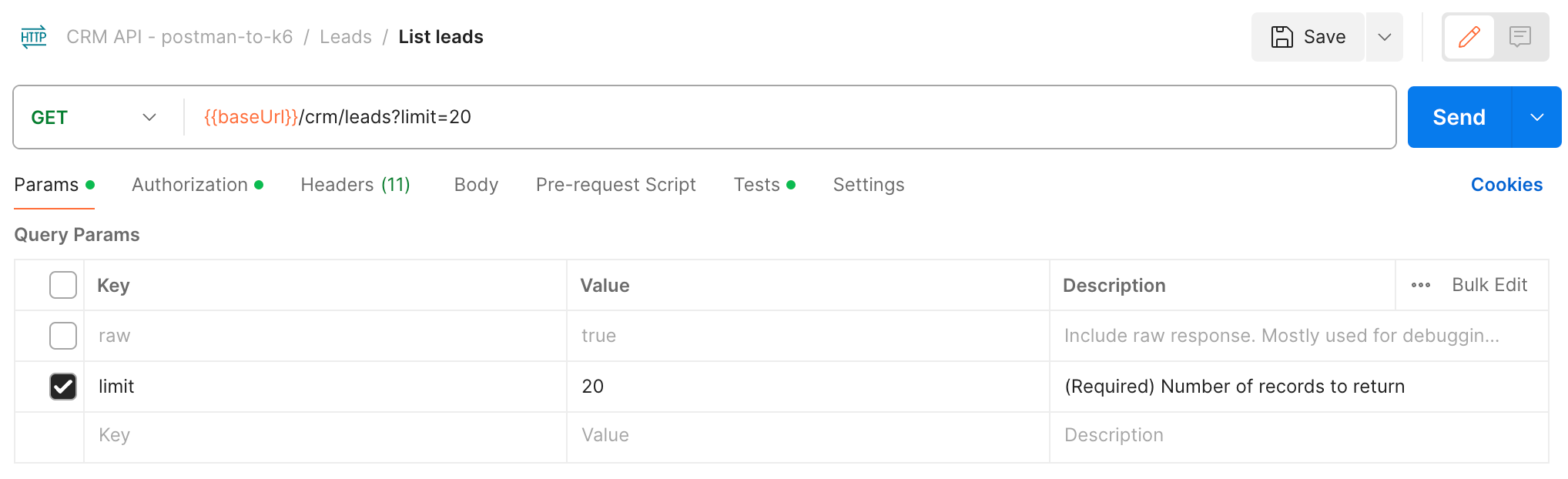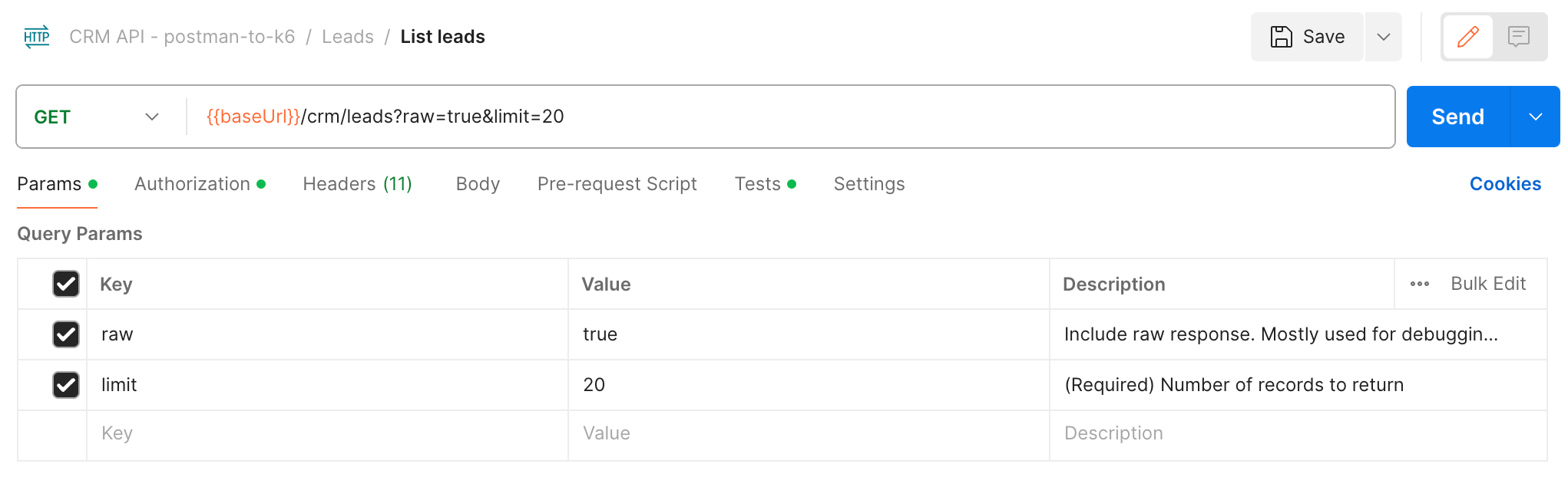 [GET]::/crm/leads - Status code is 2xx). Helpful when using the postman-to-k6 converter. - collectionPreRequestScripts : Array of scripts that will be injected as Postman Collection Pre-request Scripts that will be executed by Postman before every request in this collection. Values can be the script content or path to the script file (with