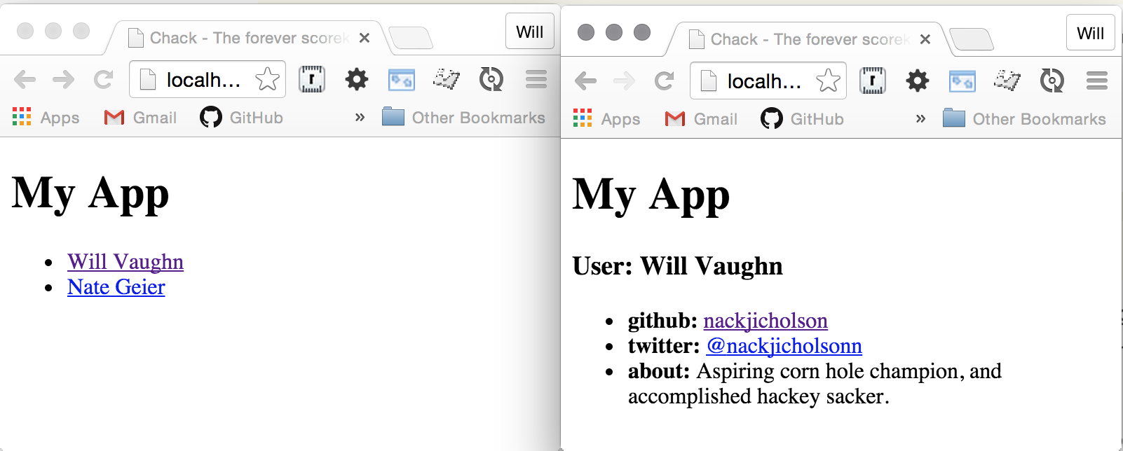 Shows a list of two "users" loaded from a hardcoded set of data from ./lib/app/users.js.