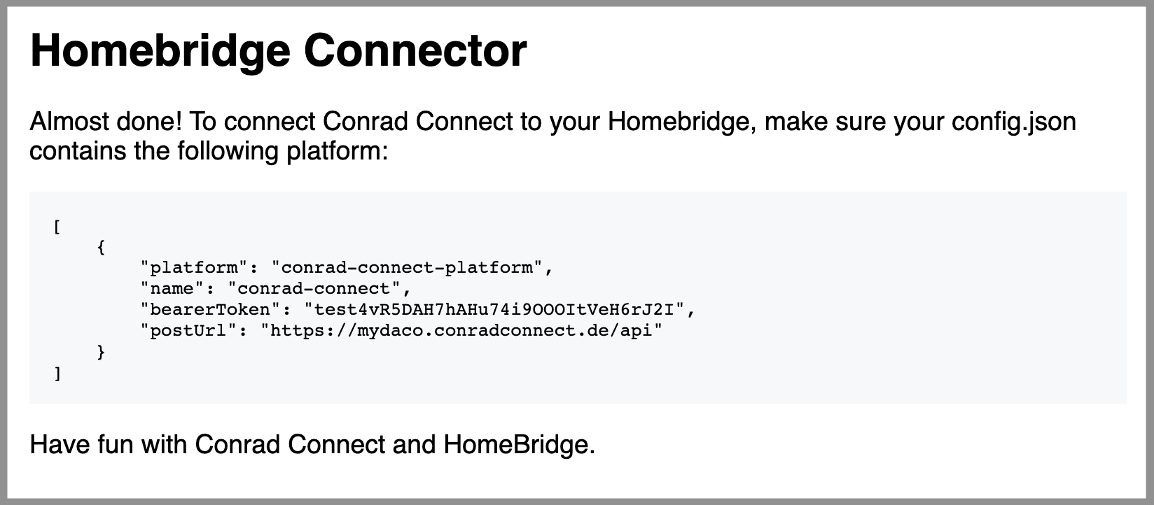 npm install -g homebridge-conrad-connect- Go to Conrad Connect, install the homebridge-connector (LINK) service and click configure to retrieve your configuration.