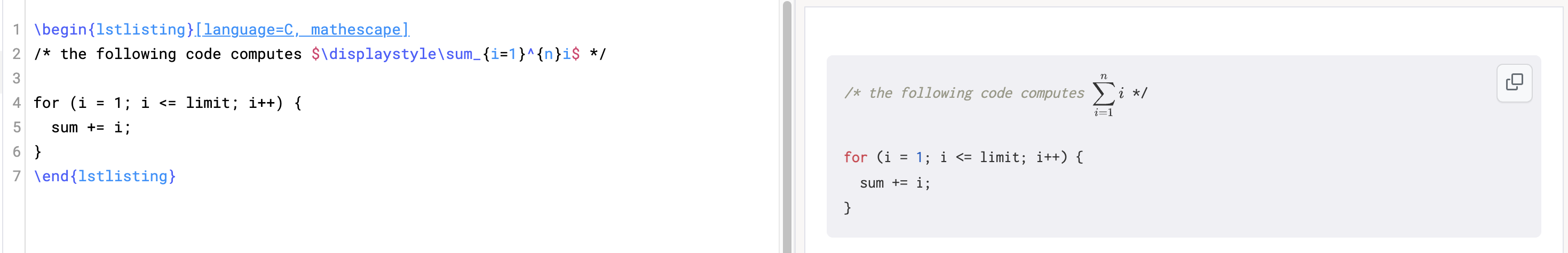 \begin{lstlisting}[language=C, mathescape]