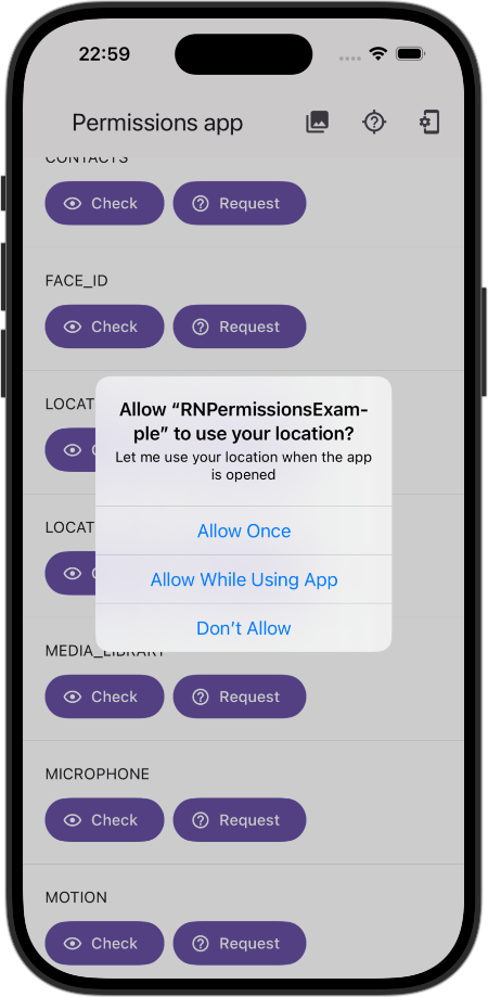 function request(permission: Permission, rationale?: Rationale): Promise<PermissionStatus>;import {request, PERMISSIONS} from 'react-native-permissions';